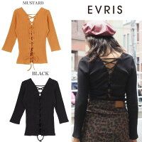 伸縮 カットソー EVRIS エヴリス バックレースアップリブトップス ブラック マスタード ラッキーシール対応 キャッシュレス5%還元 Tシャツ