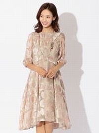 TO BE CHIC(トゥー ビー シック)ローズオパールプリントドレスベルベット素材にオパール加工(生地に透ける部分と透けない部分を作る)とプリントを施し、上品で高級感のある花柄を表現しています。裏からプリントすることで、表面に映し出される優しい色合いが実現。価値のある素材で作った大人エレガントなドレスです。衿元とウエスト部分にあしらったフリルがボディラインをすっきりとメリハリのあるシルエットに。裾に前後差を付けることで歩くたびにフレアーが揺れ、エレガントな印象を感じさせます。