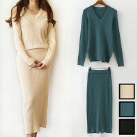 着回し自由のニットセットアップ。 リブニットの縦ラインで華奢な印象に◎ ざっくりVネックで首元もすっきりと見えます。 程よくボディラインにフィットして女性らしさがアップ! 長めのバックスリットがセクシーさもプラス♪ モデルサイズ:(167cm B84?W62?H85)
