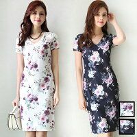 エレガントフラワー Vネック タイトワンピース